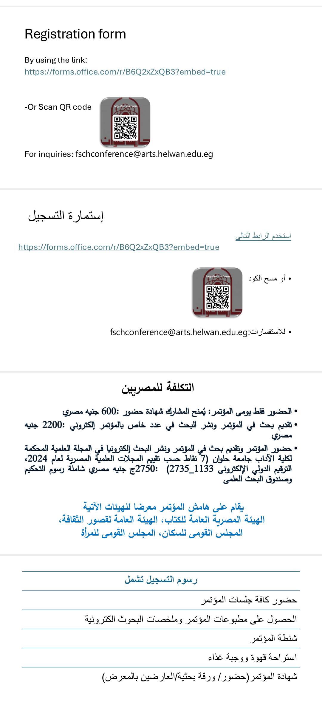 حضور المؤتمر وتقديم بحث في المؤتمر ونشر البحث إلكترونيا في المجلة العلمية المحكمة لكلية الآداب جامعة حلوان (7) نقاط حسب تقييم المجلات العلمية المصرية لعام 2024 الترقيم الدولي الإلكتروني (1133_2735) : 2750 ج جنيه مصري شاملة رسوم التحكيم وصندوق البحث العلمي