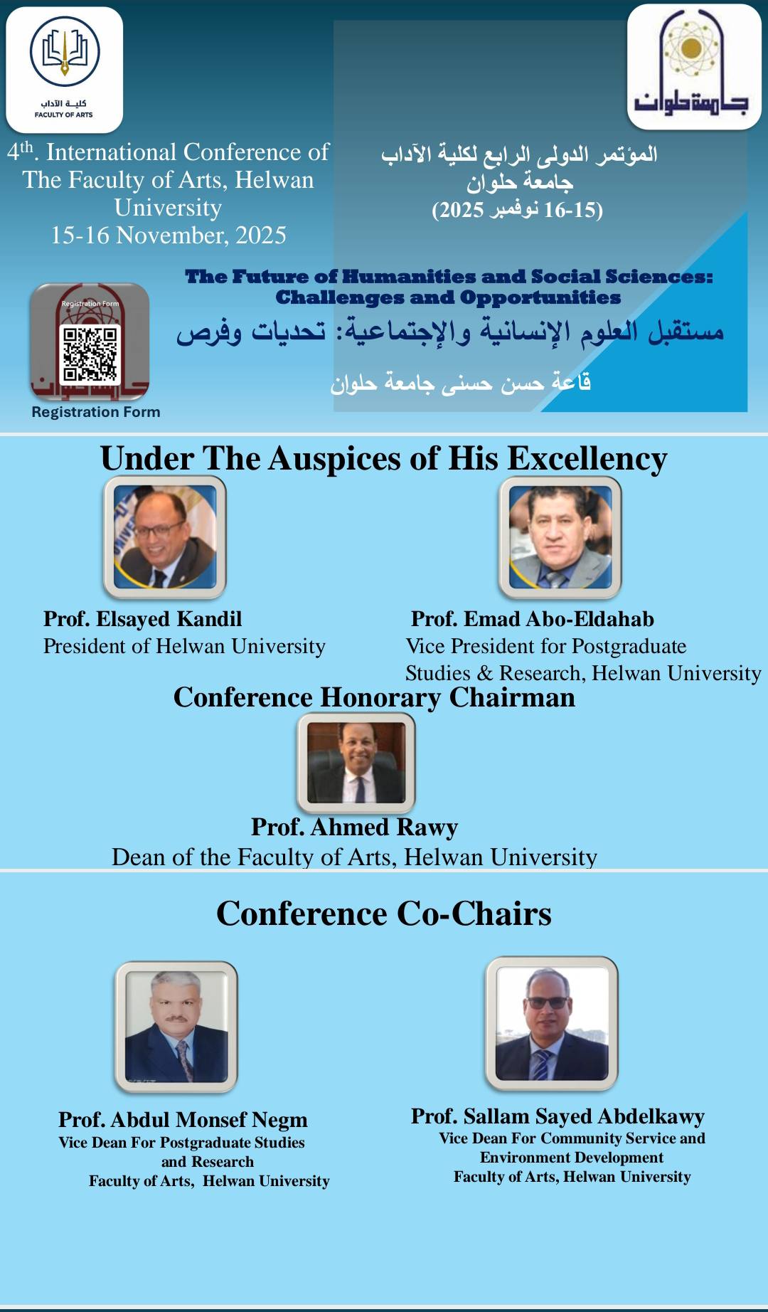 "The 4th International Conference of the Faculty of Arts, Helwan University, held from November 15-16, 2025, under the theme: 'The Future of Humanities and Social Sciences: Challenges and Opportunities'."